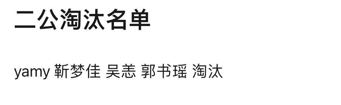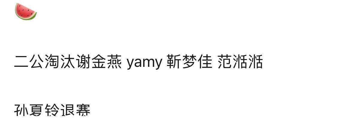 最终淘汰的4位姐姐,网上有两个版块: 第一个版块是:yamy、靳梦佳、郭书瑶、吴漾淘汰。 第二个版块是:yamy、靳梦佳、谢金燕、范湉湉淘汰,孙夏玲退赛。